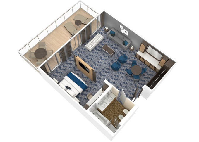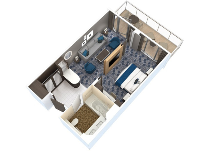 | GS - Grand Suite s balkónom 34,5 m² + balkón 10 m². 6. až 14. paluba. Max 4 osoby. Výhody Royal Suite Sky Class. | 5 040 € 2 520 € za osobu |