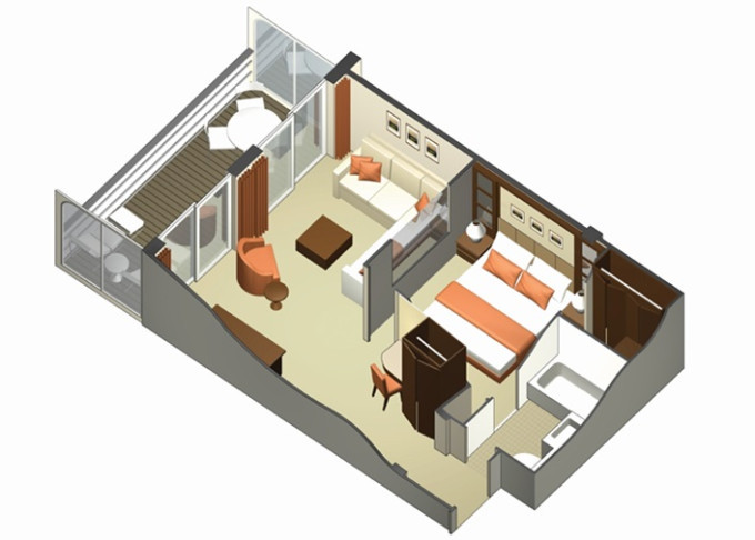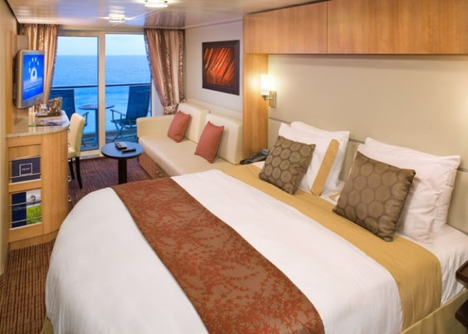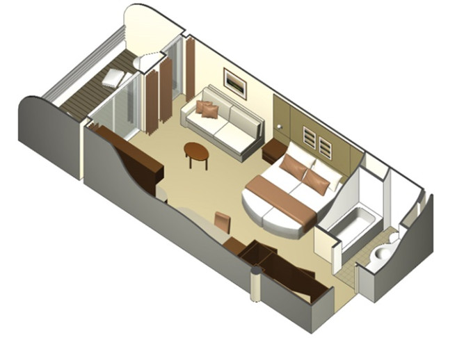 - Kajuty sú umiestnené v blízkosti lodného Spa. K ich vybaveniu patrí posilnený systém vzdušnej filtrácie, posteľ Queen-Size (v kategóriách Edge King-Size), veľké zasúvacie sklenené dvere, exkluzívne posteľné prádlo eXhale®, veľkorysé skladovacie priestory.