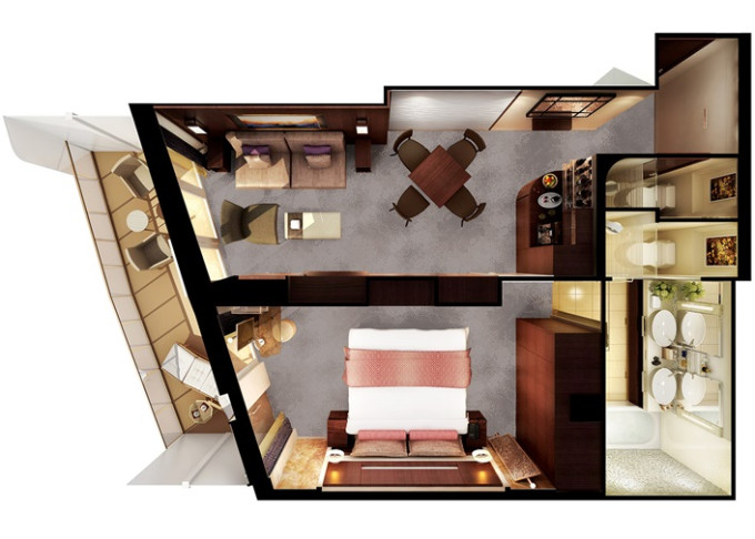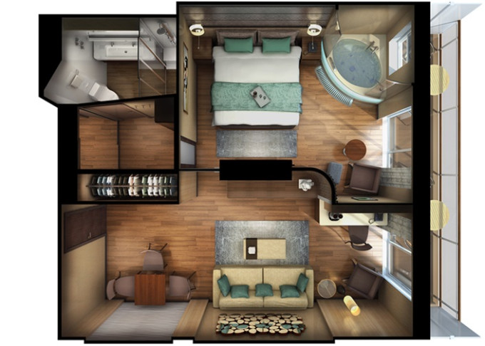 | HD - The Haven Deluxe Suite 50 m² / balkón 7 m². Vírivka. 16. paluba - vpredu. Max 4 osoby. Výhody The Haven. | 8 724 € 4 362 € za osobu |