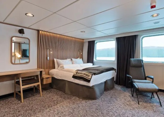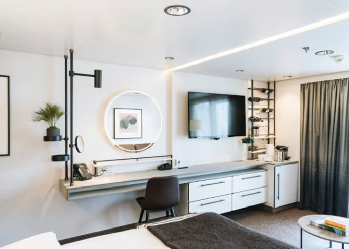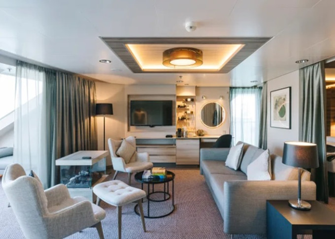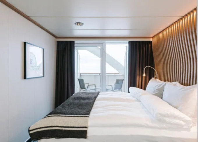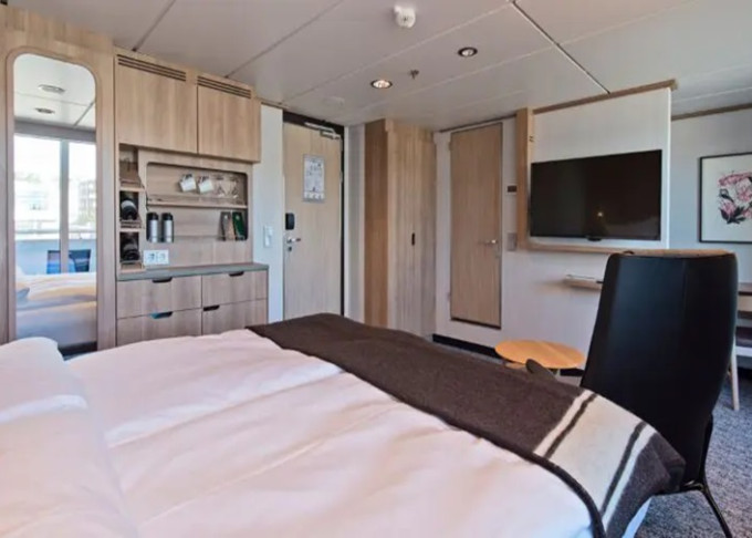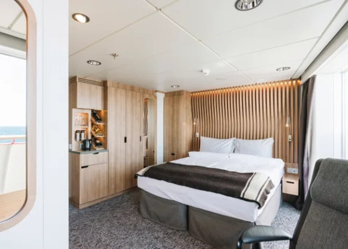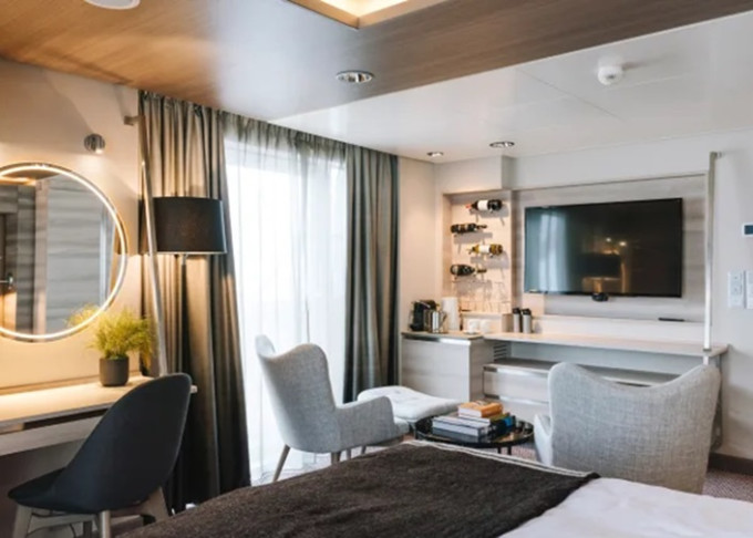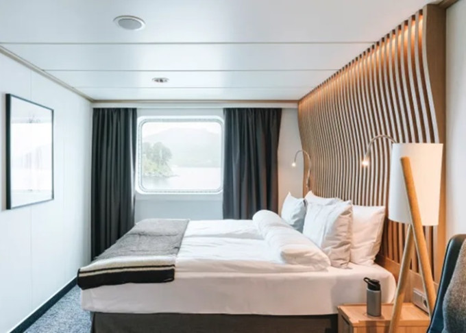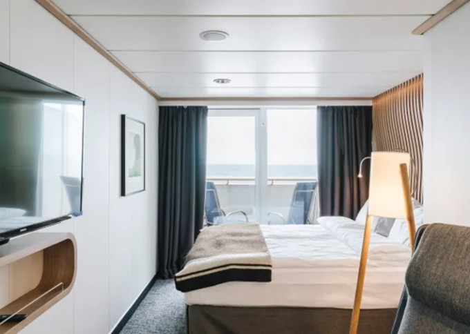 Úžasná scenéria sa odráža v bohatom a pohodlnom dizajne interiéru. Škandinávske prírodné materiály, ako žula, dub, breza a vlna, boli použité na vytvorenie štýlových kajút a verejných priestorov. Všetky kajuty sú vonkajšie, pričom 50 % má vlastný balkón, a apartmány na korme majú súkromné vonkajšie vírivky s nádherným výhľadom.