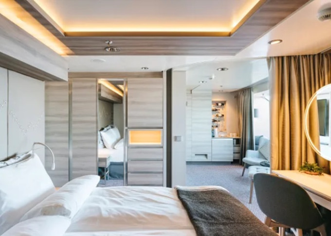MD - Expedition Large Suite s balkónom♿ 35 m². Balkón. TV, minibar, varná kanvica, kávovar, župany. Max 4 osoby. Horná paluba, na rohu. Výhody Suite. ♿ 23 142 € 11 571 € za osobu