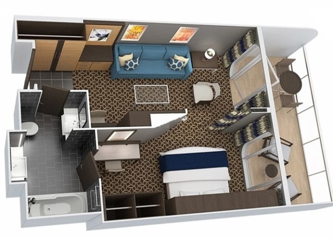 | J1 - Junior Suite s veľkým balkónom 25,5 m² + balkón 15 m². Max 2-4 osoby. Výhody Royal Suite Sea Class. | 3 024 € 1 008 € za osobu |