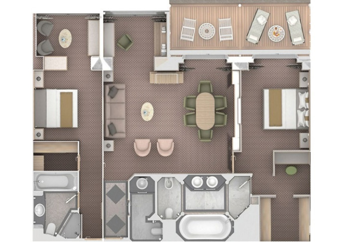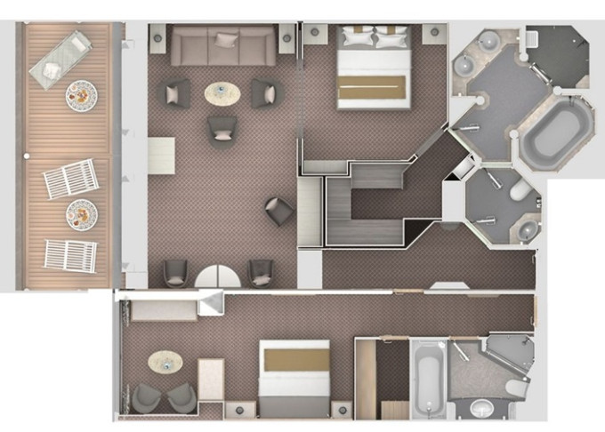 O2 - Owner's Suite 2 119 - 129 m² (vrátane balkóna m²). Owners Suite S1 spojená s Panorama Suite PA 9. paluba - stred. Max 5 osôb. 52 800 € 52 800 € za osobu