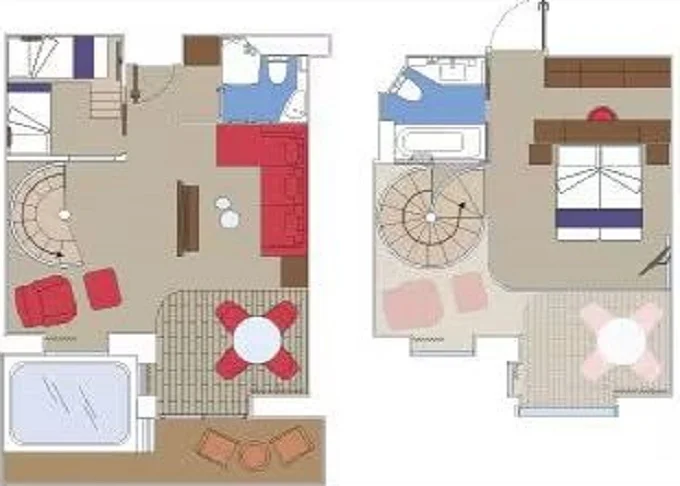 | YJD - Yacht Club Duplex Suite s vírivkou 46 m² + balkón 30 m². Vírivka. 2 podlažia, šatník, 2 kúpeľne (1 s vaňou). Max 4 osoby. 16. paluba. Cenový model MSC Yacht Club. Easy package v cene | 9 862 € 4 931 € za osobu | ||