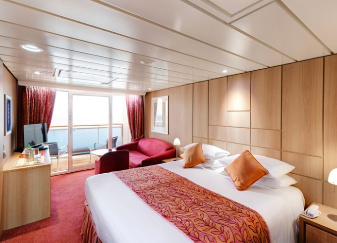 Suite s balkónom: cca 27m² kajuta s manželskou posteľou (na požiadanie 2 oddelené postele) a rozkladacia pohovka. Klimatizácia, kúpeľňa s vaňou, toaletný stolík, priestorná skriňa, TV, telefón, minibar, sejf, sušič na vlasy. Balkón so stolíkom a stoličkami. Internetové pripojenie (za poplatok).